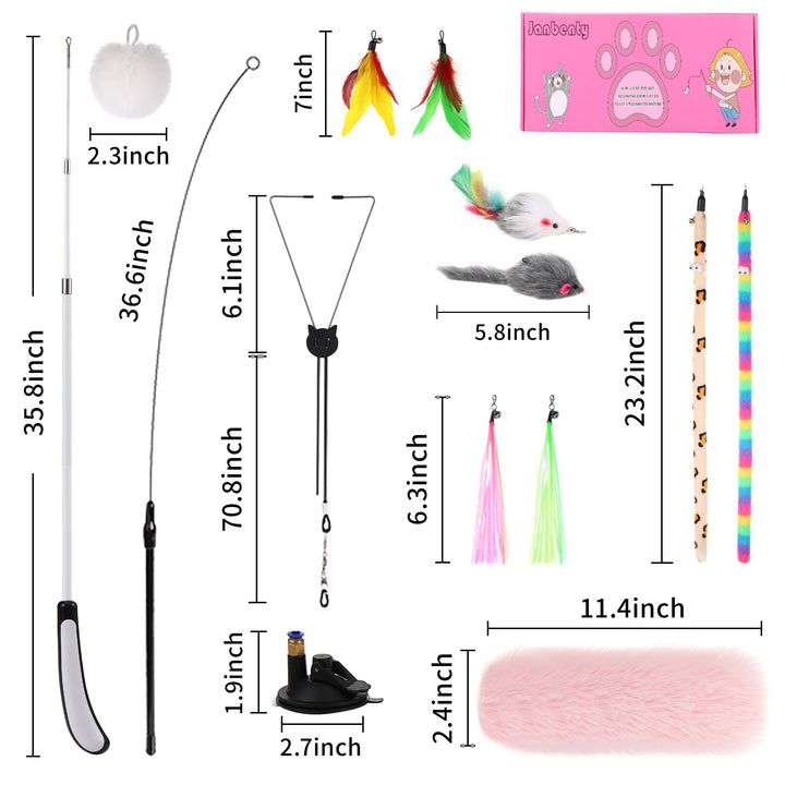 - 4-in-1 Cat Toy Set : 14 interactive cat toys pack are in a cute box,including 1 set enhanced suction cup cat toy,1 new retractable fishing pole cat toy,1 cat catnip toy,2 fur cat scratching balls,2 cat mouse toys,2 long worm cat toys,2 cat feather toys,2 Colorful tassels,1 cat triangle clip door toy,and additional 2 ropes,2 adhesive hooks.various cat toys styles provide a variety of game choices, providing your cat with multiple entertainment choices