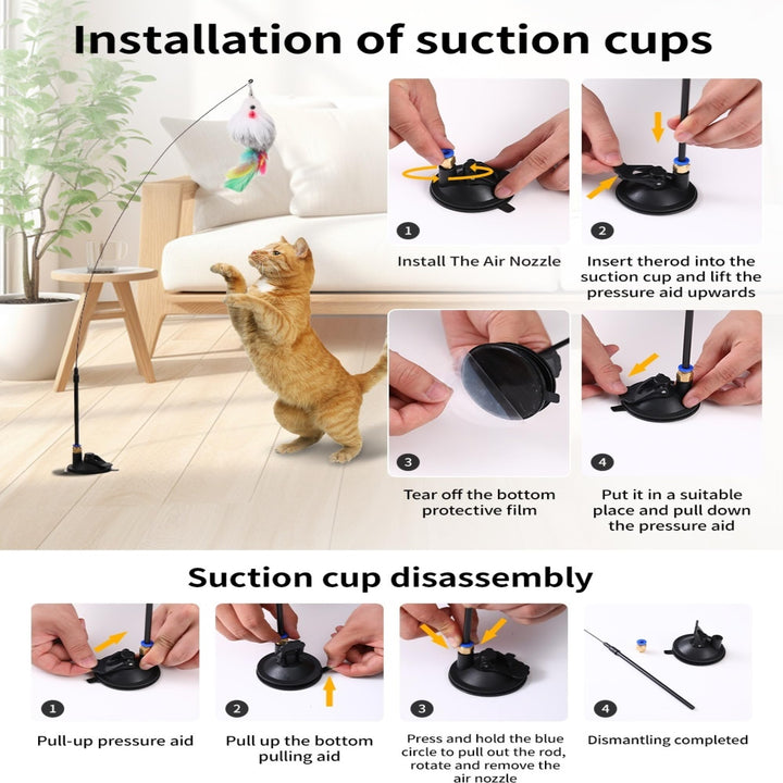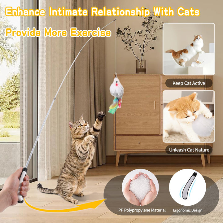 - New Retractable Cat Wand and Enhanced Suction Cups : New cat wand features an ergonomic arc design,providing a comfortable grip during extended play sessions,which makes you comfortable and not tired when holding it for a long time.PP polypropylene plastic replaces the traditional foam handle,so that your cat can avoid the danger of swallowing foam.2.7" large diameter suction cups of the cat toy base have been upgraded to strong glue can withstand 20 lbs,they can be pasted on smooth surfaces(ceramic tiles,glass,wooden floors)