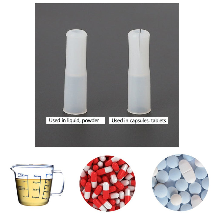 - This cat pill shooter comes with two silicone soft tips. One of the soft tips has cracks on both sides, which can be opened to clamp the pill. This is used for feeding pills. Another soft tip has no cracks and can be used for feeding water or liquid medicine. (If the crack is not large enough to clamp the pill, you can use scissors to enlarge the crack. The soft tip of the liquid feeding can also be cut open cracks on both sides to feed the pill.)