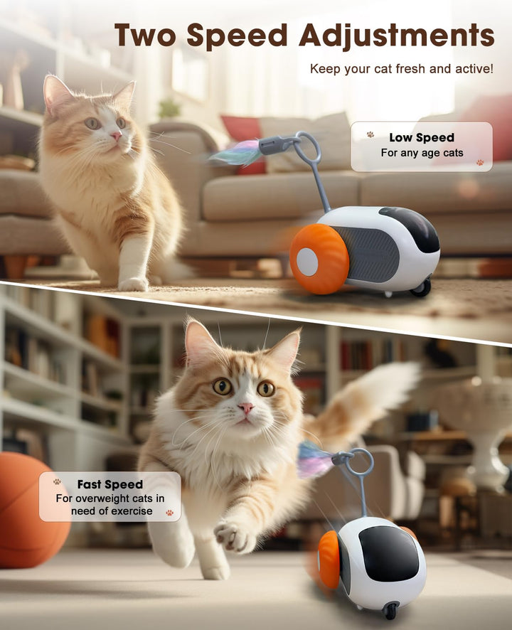 - NEW DESIGN - Dual Speed Adjustment: The speed of the cat mouse toys can be adjusted via remote control, providing both fast and slow speed settings to suit your cats mood and activity level. This ensures that each play session captures the cats interest and keeps it excited, motivating it and encouraging exercise, particularly beneficial for bored or obese cats