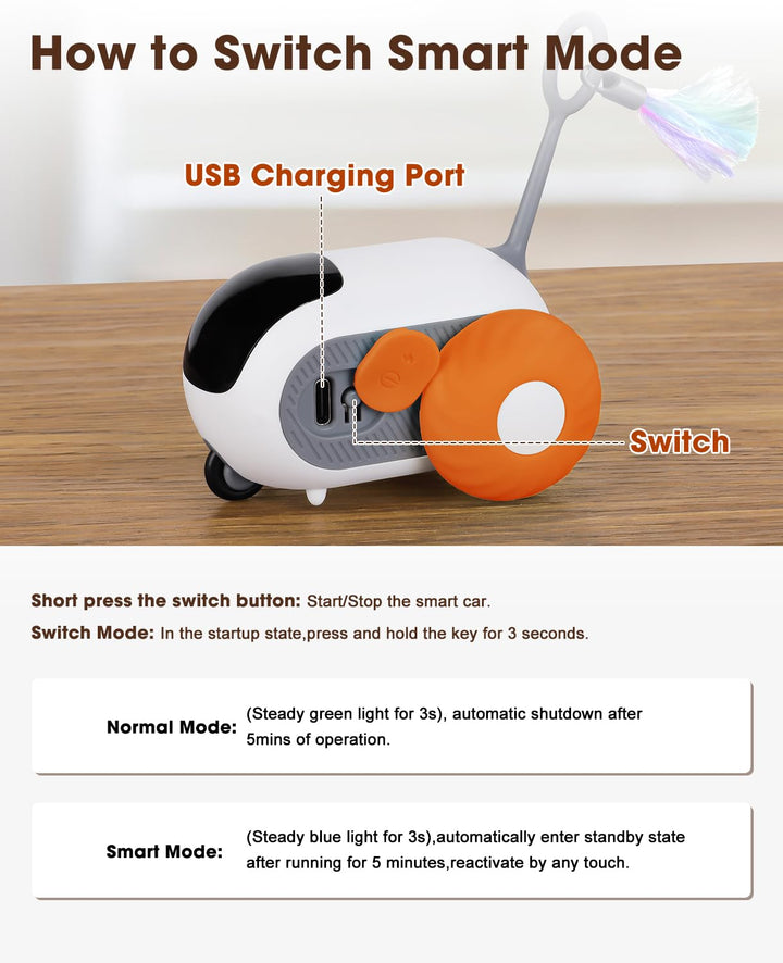 - Smart Obstacle Avoidance System: This intelligent indoor cats toy features built-in smart sensors and an automatic obstacle avoidance system, making it suitable for use on various floor surfaces like wood, tile, and carpet. When hits obstacles, walls, or furniture, it promptly backs up, rolls over, and changes direction to ensure uninterrupted playtime with your feline friend