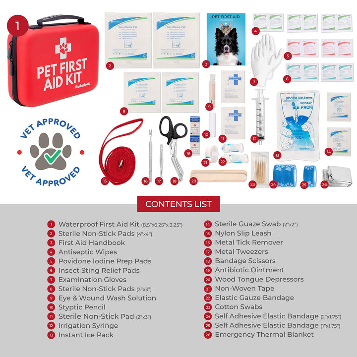 - Included Components: Pet First Aid Handbook, Tick Remover, Tweezers, Saline Solution, Scissors, Ice Pack, Leash, Antibiotic Ointment, Styptic Pencil, Antiseptic Wipes, Sting Relief Pads, Gloves, Thermal Blanket, Elastic Bandages, Non Stick Pads