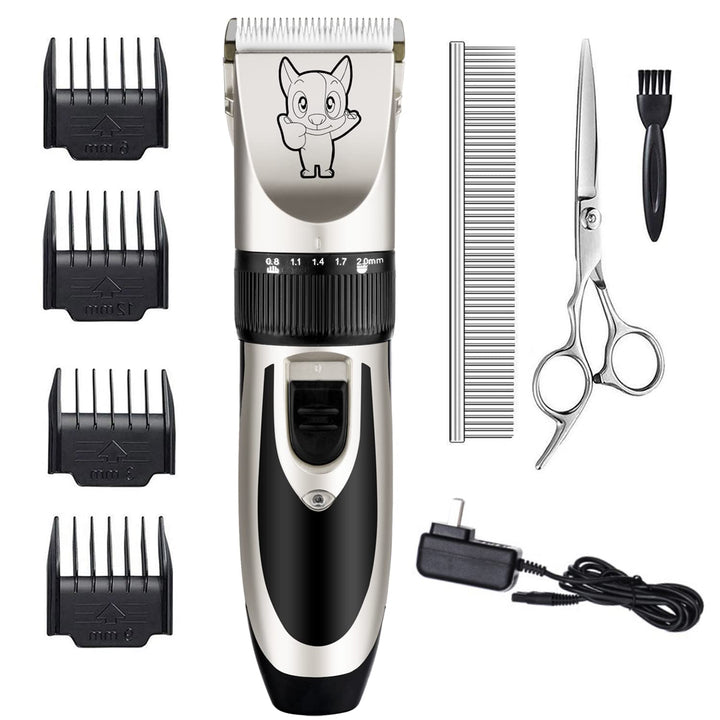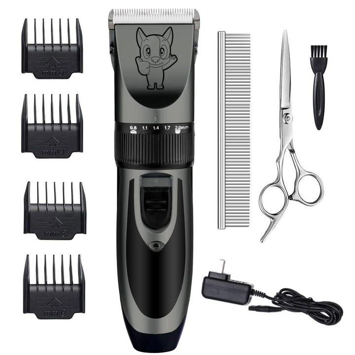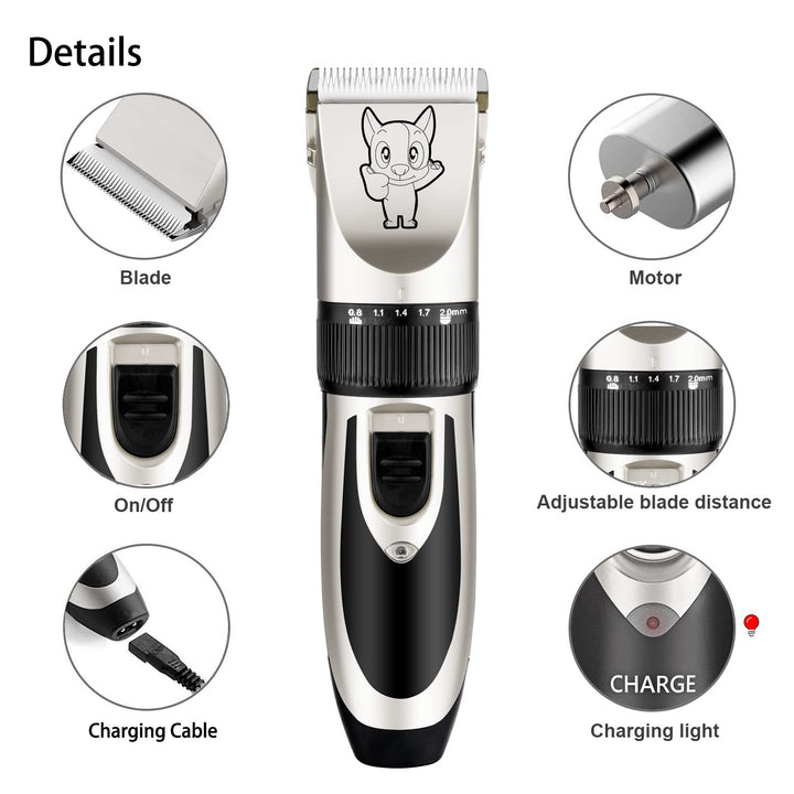 • Directions: 1. Fully charge the clippers before using for the first time or if it hasn't been used for a long time. 2. Attach the desired guard comb for clipping hair of a specific length. 3. Ensure the pet is calm before grooming. 4. If the pet has extremely long and thick hair, use scissors to cut the hair shorter first. 5. Be aware that the motor may produce some noise, and not all pets may adapt to it. 6. Use the scissors to cut long hair first if the pet has thick, curly hair. 7. Clean the clippers after use.