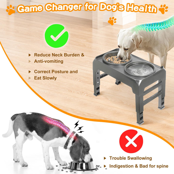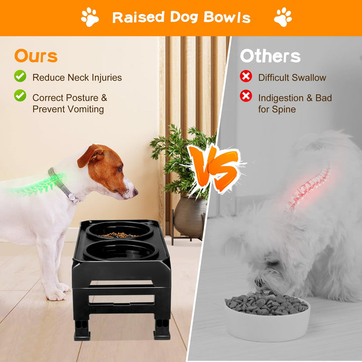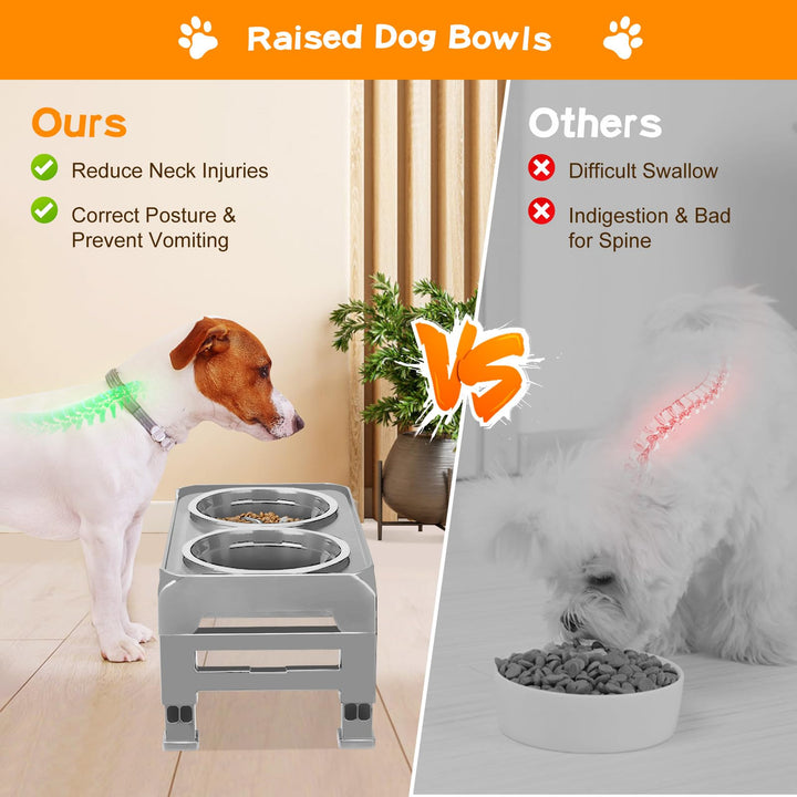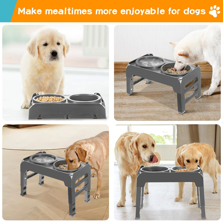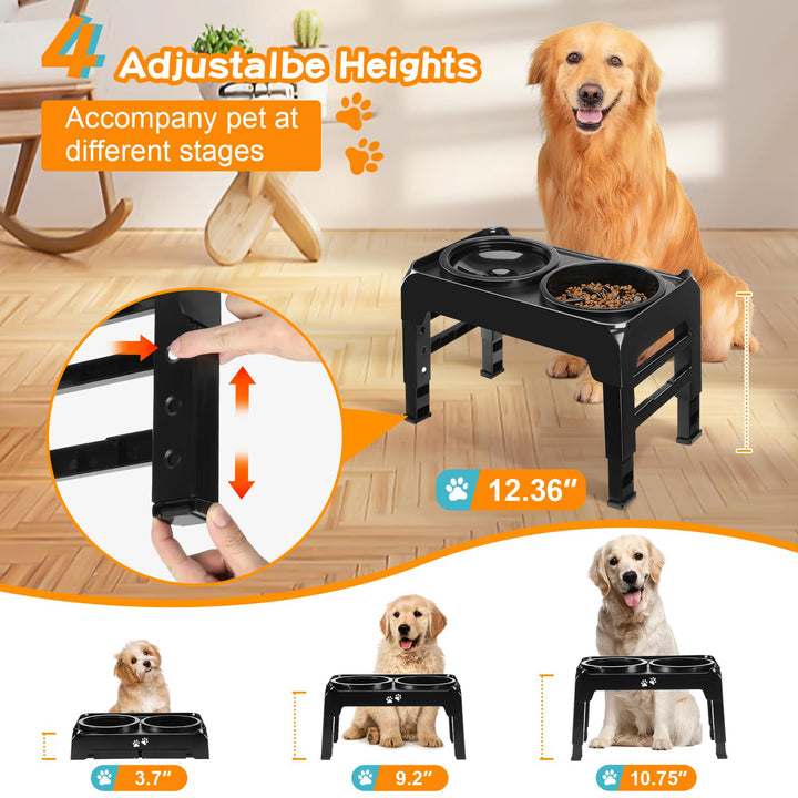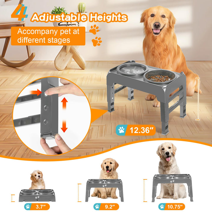 - Adjustable Height Dog Food Bowl Stand for Medium & Large Sized Dogs: Say goodbye to bending down! Our elevated dog feeder can be adjusted to 4 different heights: 3.7", 9.2", 10.75", and 12.36", accompany then from puppy to full grown. The raised dog bowls can not only makes it easier and comfortable for dogs to access their food and water, but also prevents dust or floor debris from falling into the bowls, ensuring a clean and healthy dining experience.