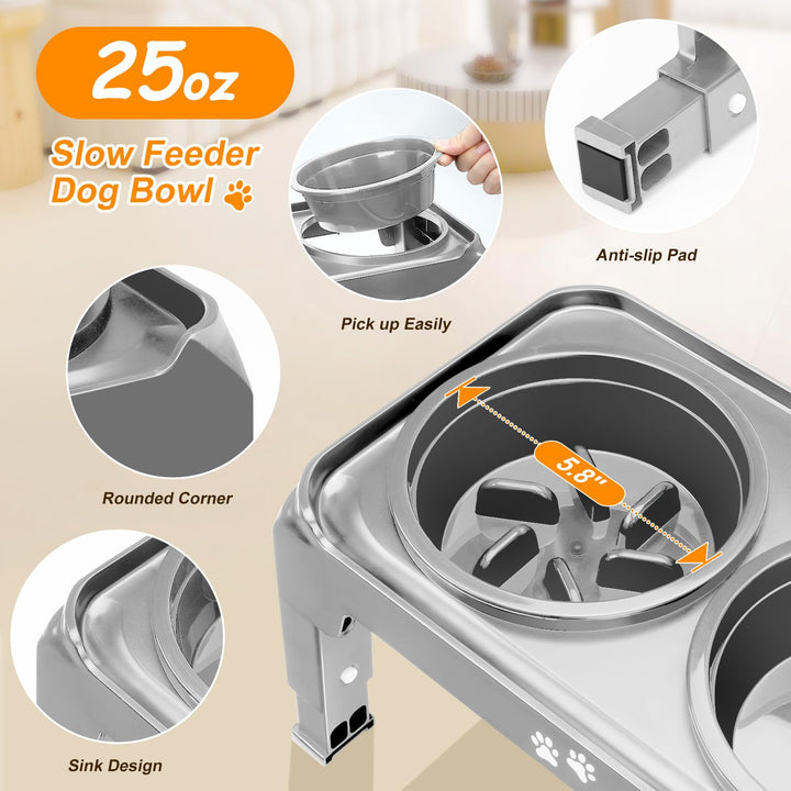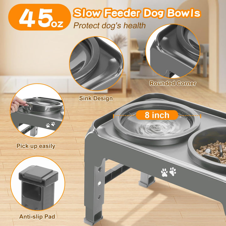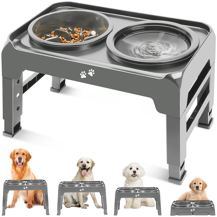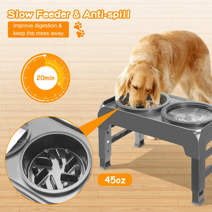 Elevated Dog Bowls, 2-in-1 Dog Feeder with Slow Feeder Dog Bowls & No Spill Dog Water Bowl, 4 Heights Adjustable Raised Dog Bowl Stand Non-Slip & Anti-Dust Dog Food Bowl for Medium Large Dogs, Grey