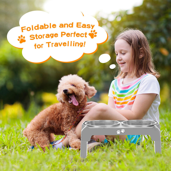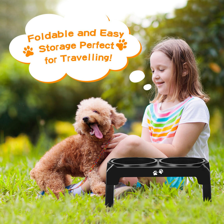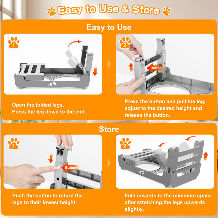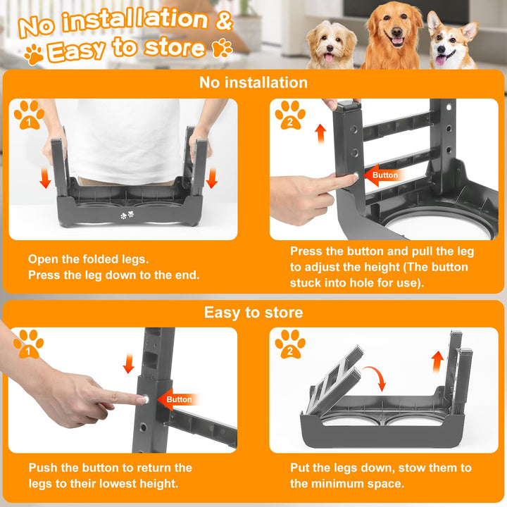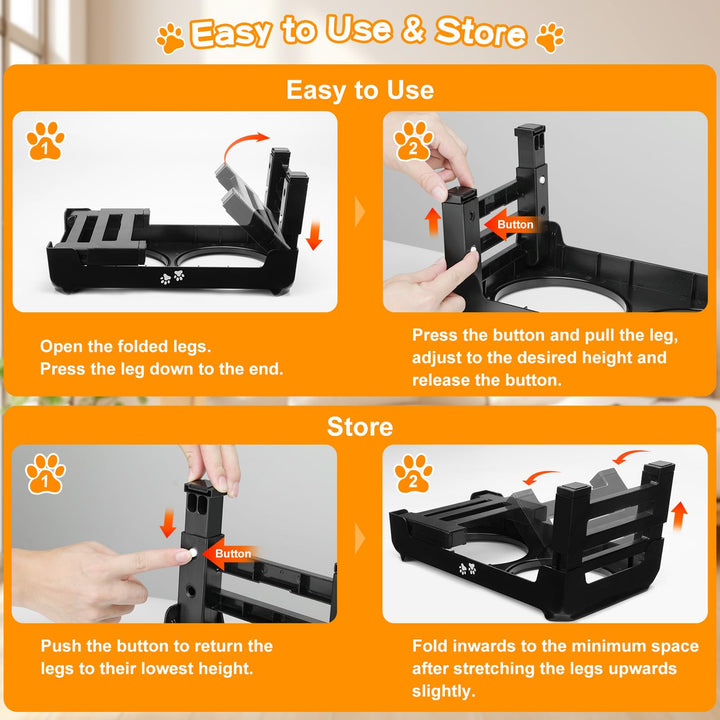 - Easy to Use & Storage for Travelling: Our elevated dog bowls can be adjusted to the desired height by simply pressing and holding the button. And there is a foldable design dog stand making it easy to store and carry for travelling.