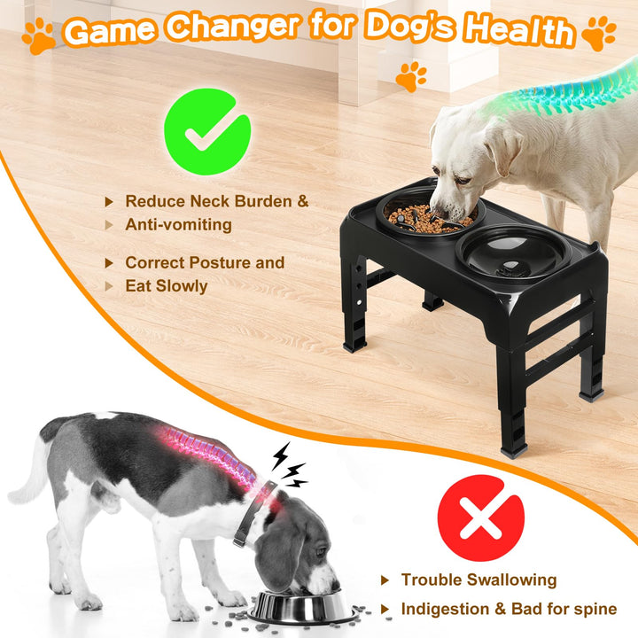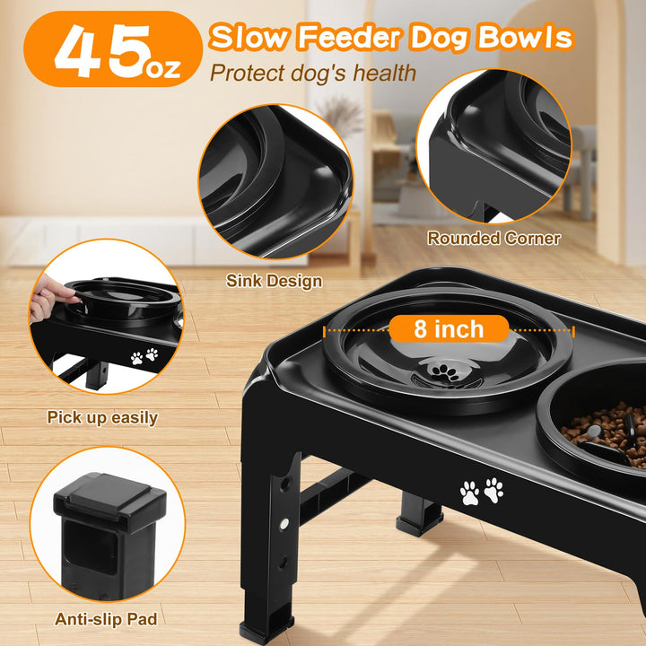 Elevated Dog Bowls, 2-in-1 Dog Feeder with Slow Feeder Dog Bowls & No Spill Dog Water Bowl, 4 Heights Adjustable Raised Dog Bowl Stand Non-Slip & Anti-Dust Dog Food Bowl for Medium Large Dogs, Black 8" for Medium Dogs