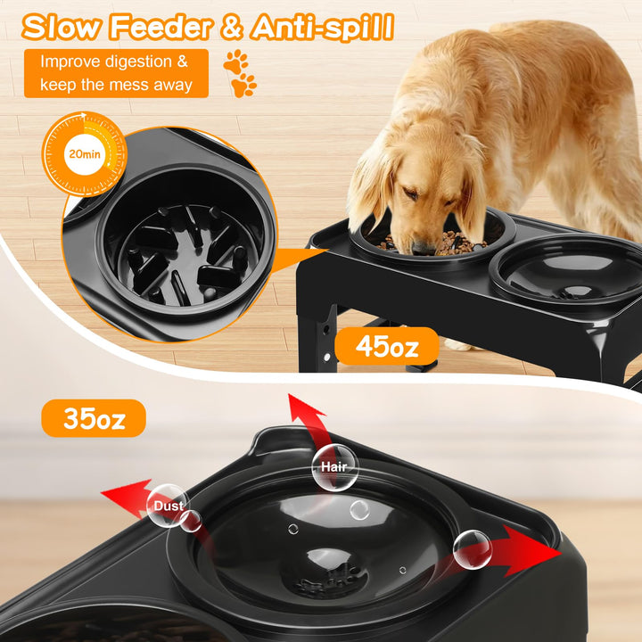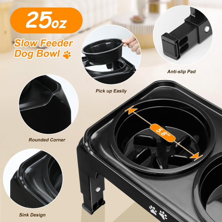 Elevated Dog Bowls, 2-in-1 Dog Feeder with Slow Feeder Dog Bowls & No Spill Dog Water Bowl, 4 Heights Adjustable Raised Dog Bowl Stand Non-Slip & Anti-Dust Dog Food Bowl for Medium Large Dogs, Black