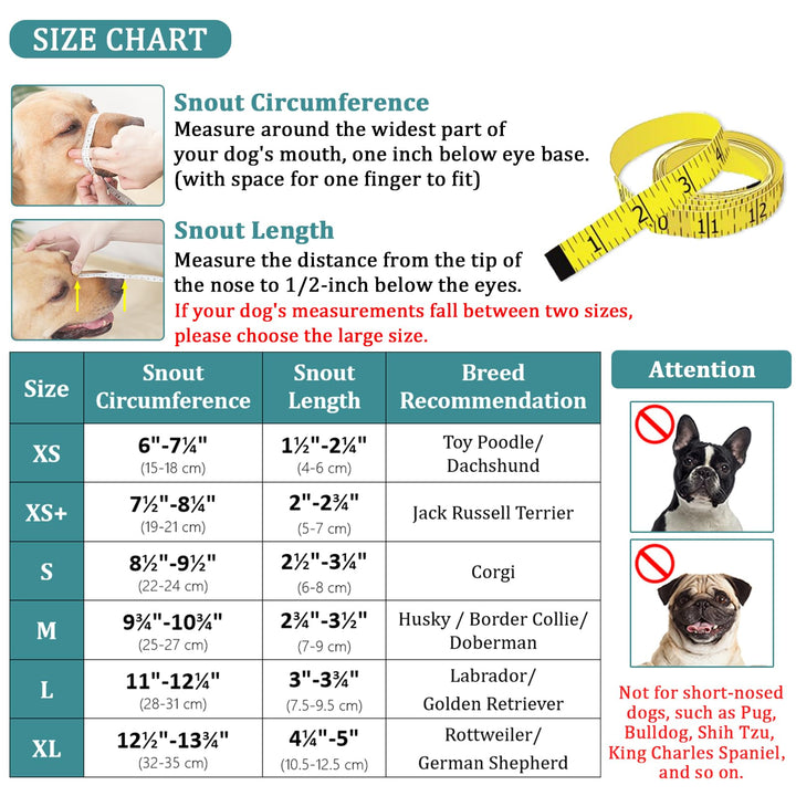 - Easy-using Dog Muzzle: Adjust the strap to fit your dog, then put it on directly, and the elastic can ensure it fits perfectly and stay securely on your dog's snout. Besides, both the neck strap and the forehead strap are adjustable, and the broader straps also help it stay in place better while your dog is running around. Patented product, counterfeiting not allowed