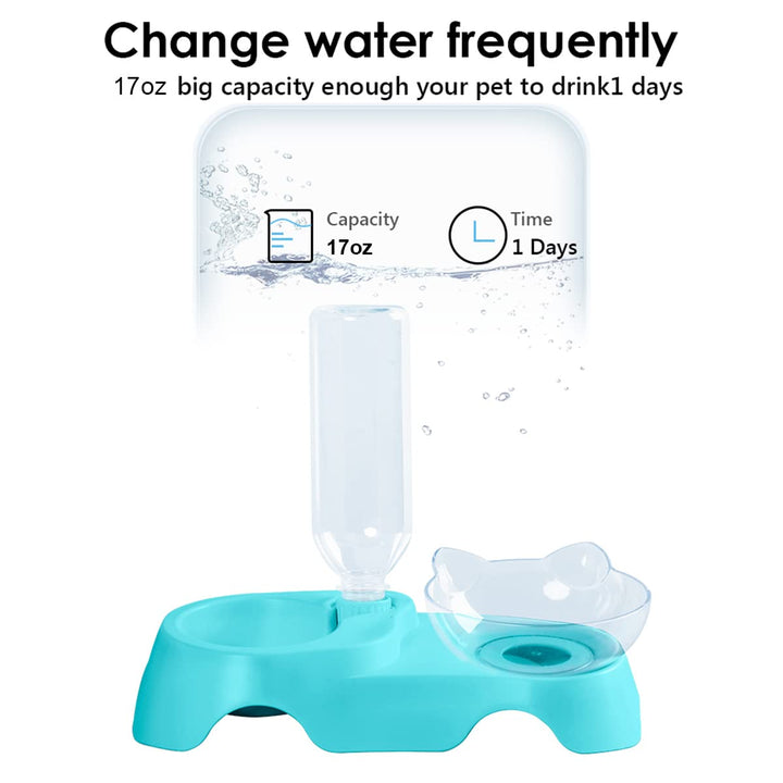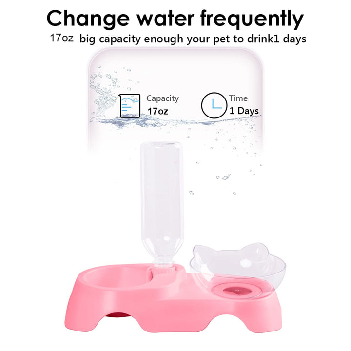 - The Water BowlsSiphon principle, stable control of water level, automatic water supply. This water bottle can hold 17oz of water. Automatic water dispenser could refill the water into the dish automatically and keep the water full .This design is very useful for your cute cats when you are not stay at home (Changing the water once a day can make your pet drink healthier!).