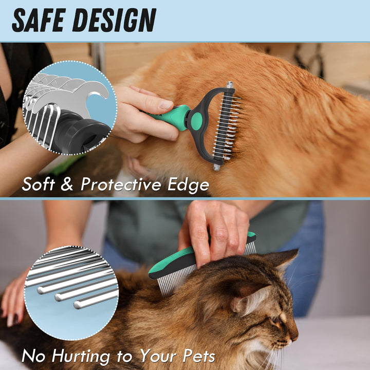 - Safe Design: Soft and protective edge brush and comb creating a comfortable feeling while detangling matted hair and deshedding without hurting your pet. Perfect metal comb for dogs, dematting comb for cats, undercoat rake for dogs double coat.